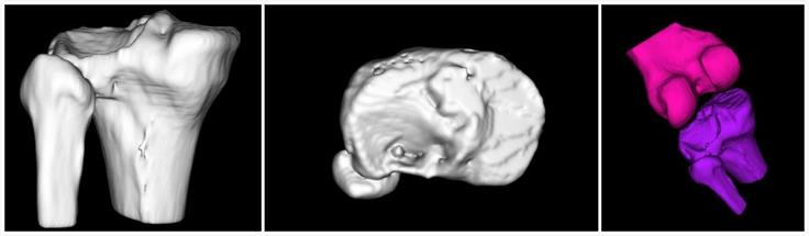 • 3D打印的骨折模型實(shí)物,供醫生進(jìn)行手術(shù)模擬、內植物選擇、提前預彎,使板型更貼合患者